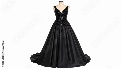 "Elegant women’s evening gown in flowing black satin with sequined details and a deep V neckline, displayed on mannequin, isolated on white background, high-resolution studio fashion photography"