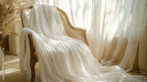 Elegant wooden armchair draped with flowing soft white fabric in sunlit room with sheer curtains and natural pampas grass creating serene and cozy atmosphere