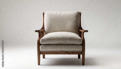 Elegant wooden armchair with plush cream fabric cushion centered against a soft white backdrop, showcasing a minimalist design and modern aesthetic.