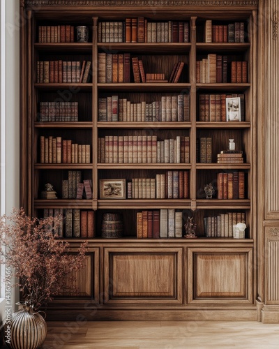 Elegant wooden bookshelf filled with vintage books and decorative items, creating a warm, inviting atmosphere.