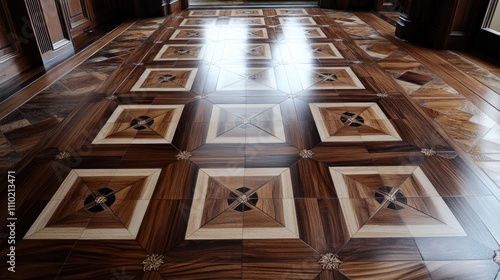 Elegant wooden flooring installation showcasing intricate patterns and rich textures in a modern home interior setting.