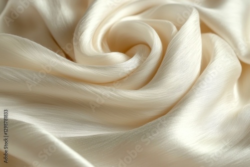 Elegantly draped cream silk fabric forms soft, flowing folds, highlighting the luxurious texture and subtle sheen, creating an exquisite, delicate, rose-like composition.