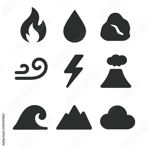 Elements Icon Grid. Solid, filled icon set of The Elements: fire flame, water drop, earth rock, air swirl, lightning, volcano,