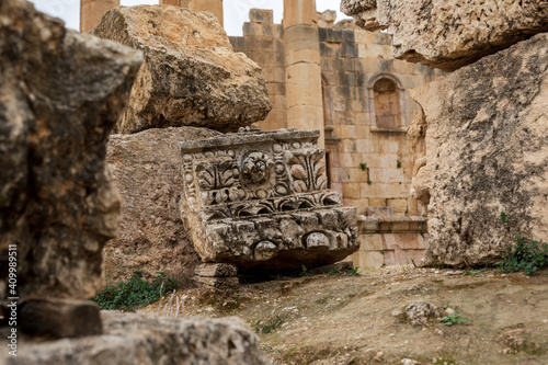 Elements of ancient pillars at the ancient Roman city of Gerasa in Jerash, Jordan