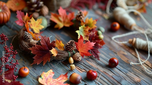 Elements of autumn decor on a wooden table. The centerpiece is a wreath decorated with colorful faux leaves, pine cones and small pumpkins.