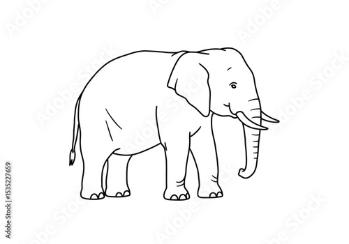 Elephant drawing. It is a black and white outline image of an elephant, a large mammal known for its distinctive trunk, tusks, and large ears. Vector sketch line art draw.