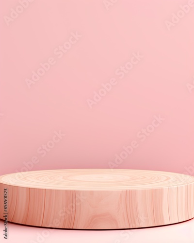 Elevate your beauty product presentation with this sophisticated mockup. A rustic wood slice podium stands against a delicate light pink background, intertwining the raw beauty of nature