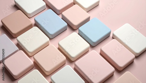 Elevated Soft 3D Square Blocks Arrangement on a Pastel Pink Background in Gentle Color Tones