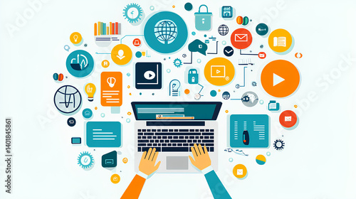 E-library and E-learning Concept, Person using laptop with virtual E-Book icons for online knowledge Base, Digital library, Access electronic books on Internet. Course education. Webinar technology