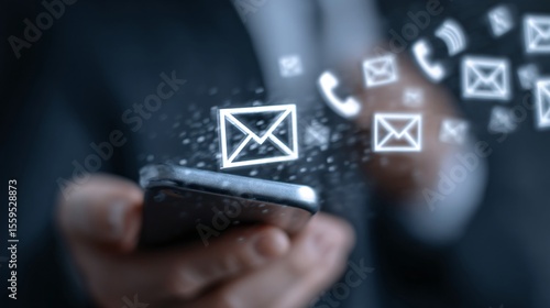 email and phone support icons hovering above businessman's hands, modern service visualization