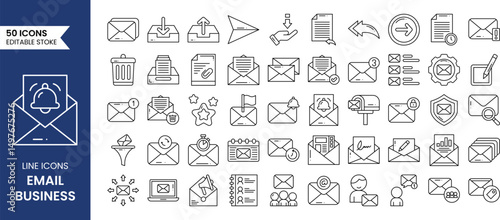 Email line editable icon set. Set of 50 outline icons related to email business. Editable stroke. Vector illustration