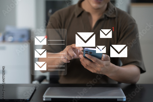 Email notification concept, Male use smartphone and laptop receive message alert in the mailbox.