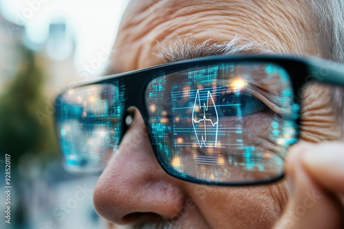 Embracing Futuristic Wellness: Elderly Person Using Smart Glasses for Health Tracking Against Abstract Urban Backdrop