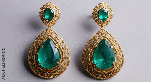 Emerald teardrop earrings framed with intricate golden filigree detailing