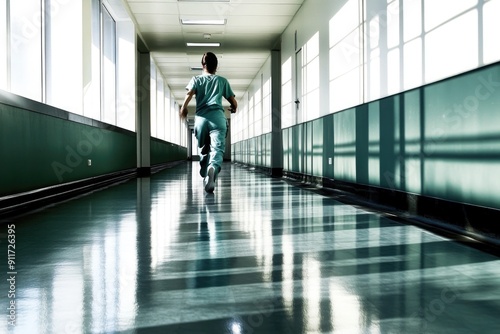 Emergency Response: Doctor Running Through Hospital Corridor Amidst Chaos for Rapid Medical Attention