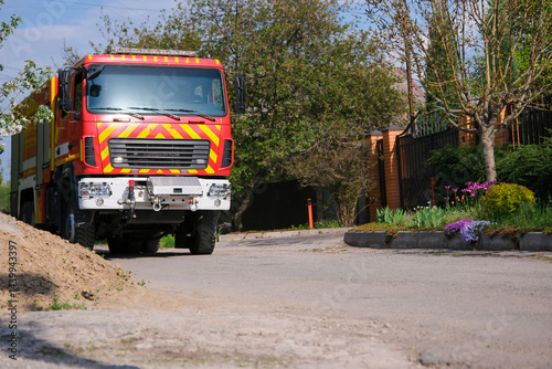Emergency vehicle ready for firefighting operations on a clear sunny day.