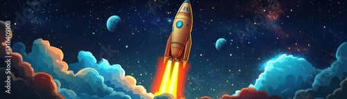 Emerging new space exploration technology with futuristic spacecraft flat design side view outer space theme cartoon drawing vivid