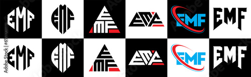 EMF letter logo design in six style. EMF polygon, circle, triangle, hexagon, flat and simple style with black and white color variation letter logo set in one artboard. EMF minimalist and classic logo