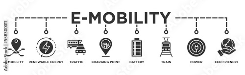 E-mobility banner web icon vector illustration concept with icon of mobility, energy, traffic, charging point, battery, lrt, power and eco-friendly