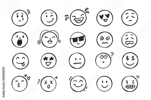 Emoji face icon doodle set. Faces with different emotion mood. Hand drawn comic sketch style.