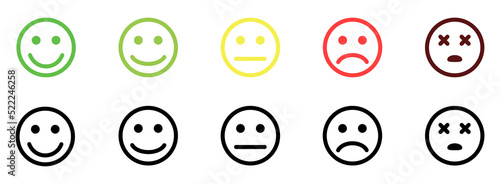 Emoji icon set of satisfaction level. Simple feedback in form of emotions in flat style. Customer feedback. Range to assess the emotions Excellent, good, normal, bad, awful symbols Vector illustration