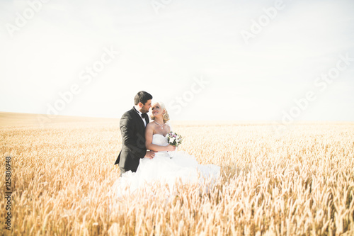 Emotional beautiful bride hugging newlywed groom at a field closeup