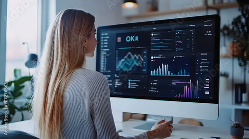 Employee Engaged in Goal Discussion, Modern Office with Large Screen OKR Display, Clean Minimalist Design