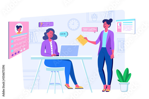 Employee hiring process concept with people scene for web. Woman submits resume for open vacancy. HR manager selects candidate and interviews at meeting. Illustration in flat perspective design