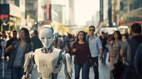 Employee robot walking with peoples. humanoid AI robot crossing street. future automation job.