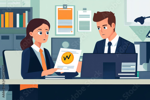 Employees reviewing files with warning indicator, discussing important documents in office setting. atmosphere conveys concern and professionalism
