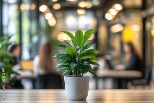 Employees working in eco-friendly office with plants, laptops - Out of focus business team - sustainable workspace