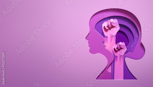 Empowered Feminine Silhouette with Raised Fists Depicting Strength, Unity, and Feminism in a Vibrant Purple Paper Cut Style Artwork. Symbol of Women’s Rights, Resilience, and Collective Action