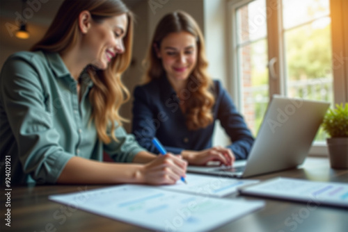 Empowering Collaboration: A Woman and Friend Strategically Navigating Business Projects Together with Laptop and Paperwork.
