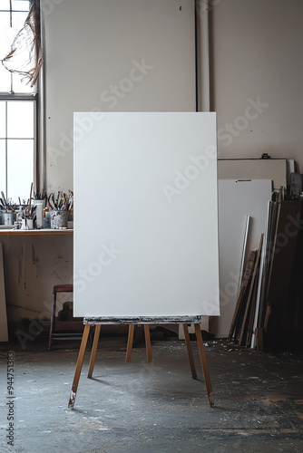 Empty artist's canvas on an easel in a rustic studio, ready for painting, with art supplies in the background.