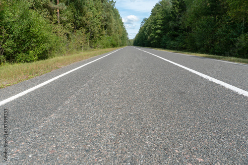 Empty asphalt road through woods and fields. New fresh asphalt pavement away from the city. Development of rural infrastructure. Road marking lines close up.