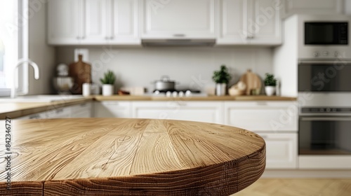Empty beautiful round wood tabletop counter in clean and bright kitchen background