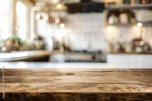 Empty Beautiful wood table top and blur bokeh modern kitchen interior background in clean and bright