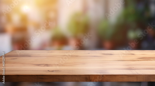 Empty Beautiful wood table top and blur bokeh modern kitchen interior background in clean and bright, Ready for product montage created with Generative Ai