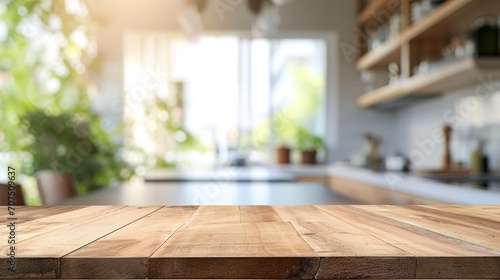 Empty beautiful wood table top counter and blur bokeh modern kitchen interior background in clean and bright