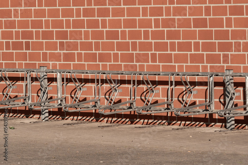 Empty bicycle rack casting shadows on pavement in front of brick wall