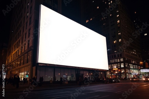 Empty billboard at night in New York City, pedestrians and cars passing by