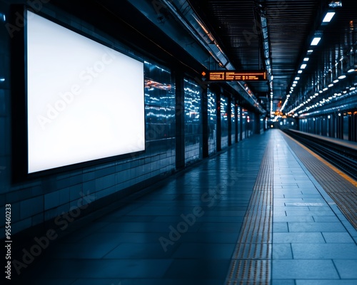 Empty billboard in a modern subway platform, illuminated by soft lighting, ready for creative or commercial content