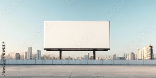 Empty billboard on urban rooftop with city skyline background. Ideal for advertisement or message display.