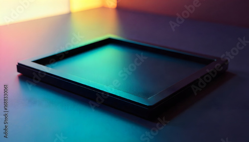Empty black frame glowing with vibrant colorful gradient light on dark surface