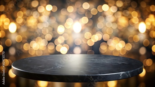 Empty black round marble table in front of blurry lights, marble, table, black, empty, round, lights, blurred