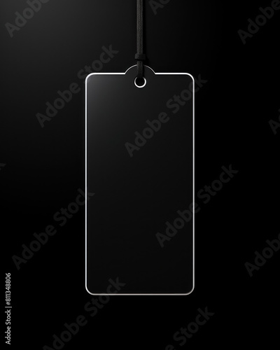 Empty, black, stylish label on rope, tag for price on minimalistic black background, concept of shopping, sales and discounts