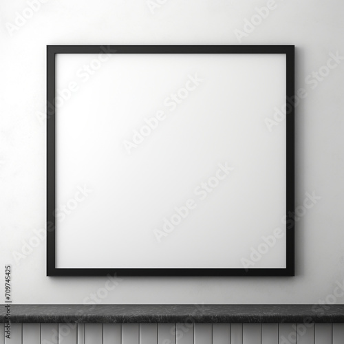 empty black wooden frame filled with white matte board hanging on blank wall created with Generative Ai