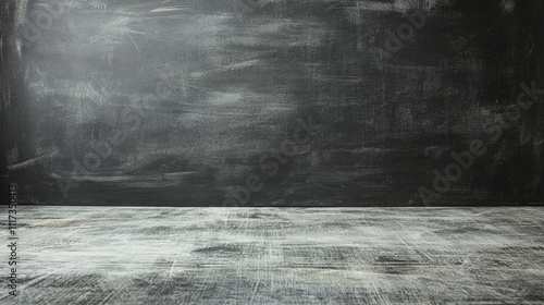Empty blackboard with a wooden floor in a classroom setting, ready for lessons or creative writing projects, evoking a sense of learning and potential.