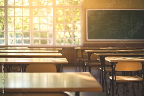 Empty classroom, sunlight through window, chalkboard, learning environment