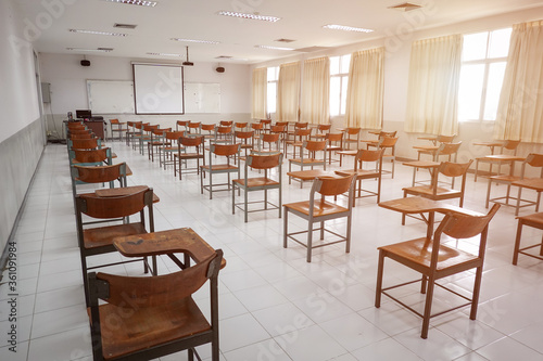 Empty classroom with vintage tone wooden chairs. Classroom arrangement in social distancing concept to prevent COVID-19 pandemic. Back to school concept.